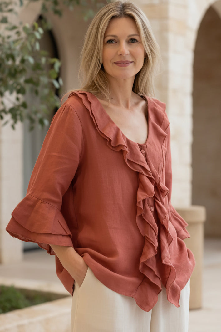 Introducing the Virginia Shirt, a timeless addition to your wardrobe. Made from a soft, breathable polyester blend, it keeps you cool and comfortable, while playful ruffles along the front add a charming touch of style.